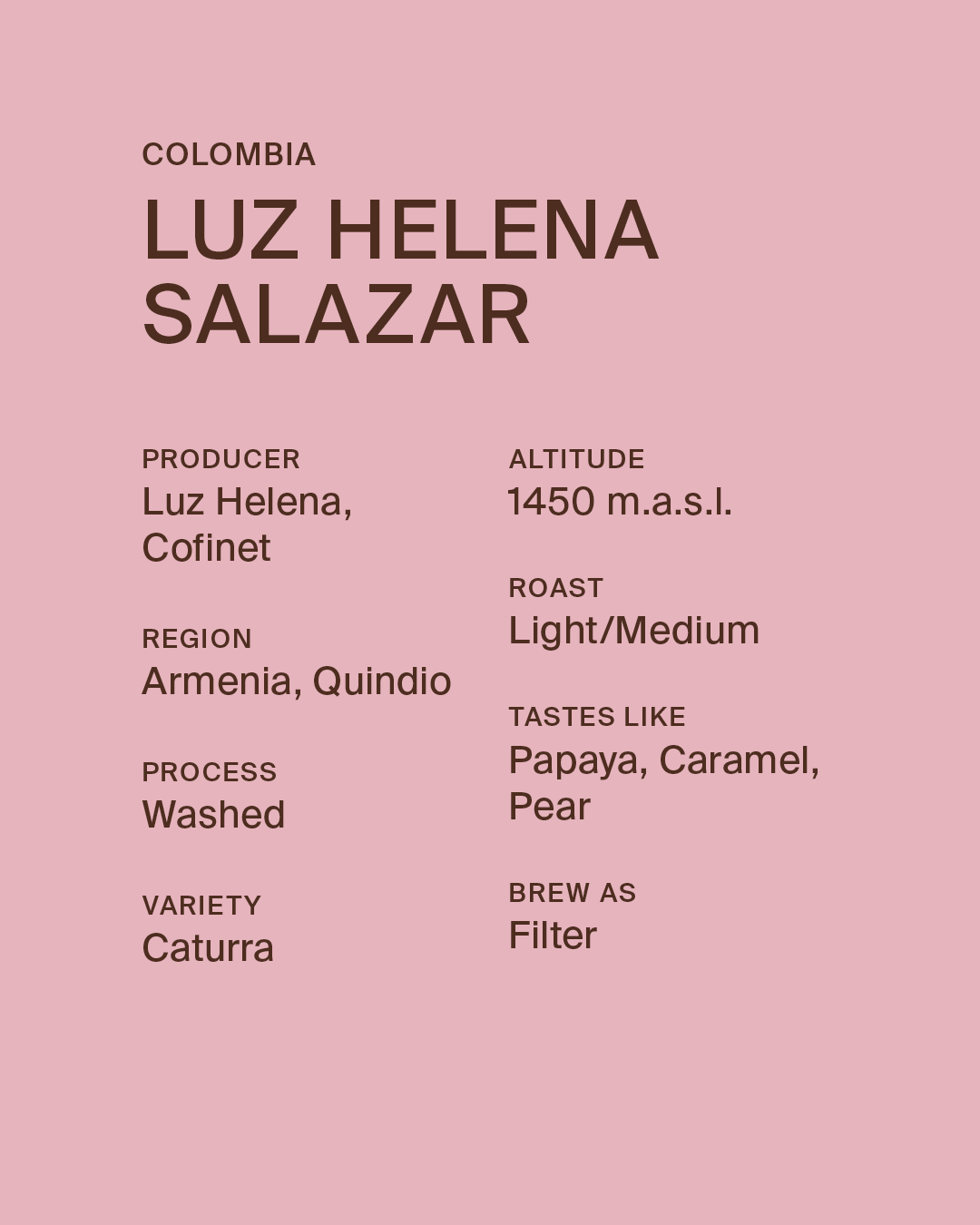 Grown at 1450 m.a.s.l in Armenia, Quindío, this lot comes from Finca Maracay — an eight-hectare farm owned and cared for by Luz Helena. Over her 20 years of producing, Luz has refined her approach, focusing on producing exceptional specialty coffee through careful farm management and selective picking.